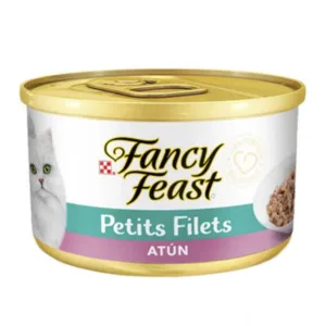 - Fancy Feast Petits Filets Atún es un alimento formulado para gatos, presentado en un paquete de 85g.