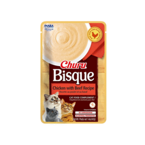 El Churu Bisque Crema de Vacuno es una opción irresistible para consentir a tu gato con una combinación única de pollo de granja y vacuno. Su textura cremosa y su alto contenido de humedad lo convierten en el snack ideal para complementar su dieta de forma saludable y deliciosa.