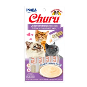 - Churu Gato Chicken With Shrimp es un alimento formulado para gatos, presentado en un paquete de 56g.