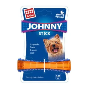 - Gigwi Johnny Stick es un juguete formulado para perros, presentado en forma de palo con sonido y colores naranja y azul.