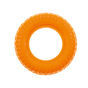 Diseñado con material TPR (termoplástico resistente y flexible), este juguete en forma de rueda es ideal para perros pequeños que disfrutan morder y jugar, ayudando a aliviar el estrés y la ansiedad.
