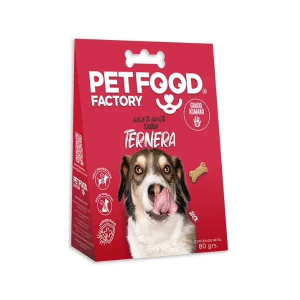 Las galletas Petfood Factory son un snack ideal para perros adultos. Estas deliciosas galletas, con forma de huesitos, han sido preparadas con ingredientes de grado de calidad humano. Tienen un sabroso sabor a ternera y una textura crujiente que seguramente serán las favoritas de tu perrito. El tamaño de cada galleta es ideal para perros adultos de todas las razas.